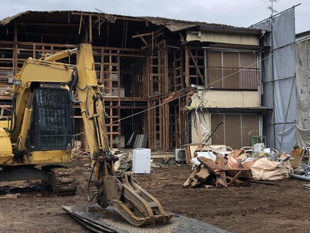 足場を養生し、2階は手壊し、1階部分は重機にて解体しております。