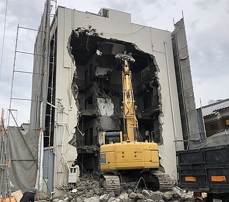 【RC造4階建解体】工付近では住宅が多い場所だった為、近隣住民の方々にご迷惑を極力掛けないよう特に振動・騒音・埃等が舞い散らない様心掛けておりました。