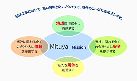 お客様の大切な資産をお預かりするという責任をもって、「ミツヤ建設にお願いして良かった」と最後に言っていただけることを目標に工事のエキスパートとして尽力させていただきます。解体工事に限らず、様々な工事に弊社ならではの高い技術と深い知識でお応えしてまいります。