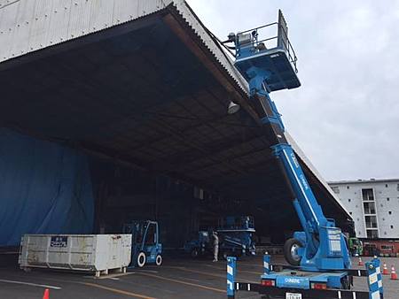 市街地近郊の倉庫のため一般車両や歩行者などの通行などに配慮した。(交通誘導員の配置や作業の一旦停止の合図など全員に周知)